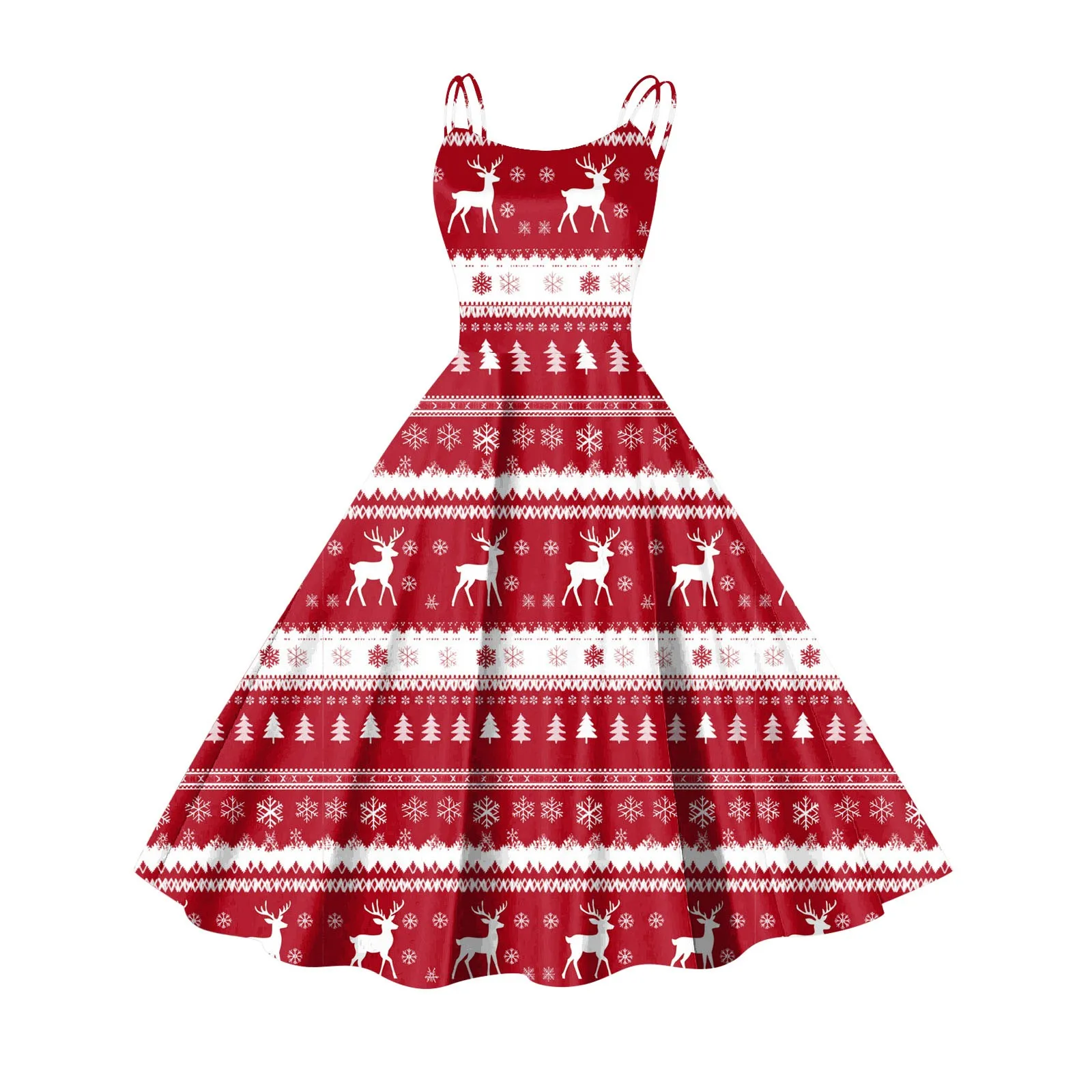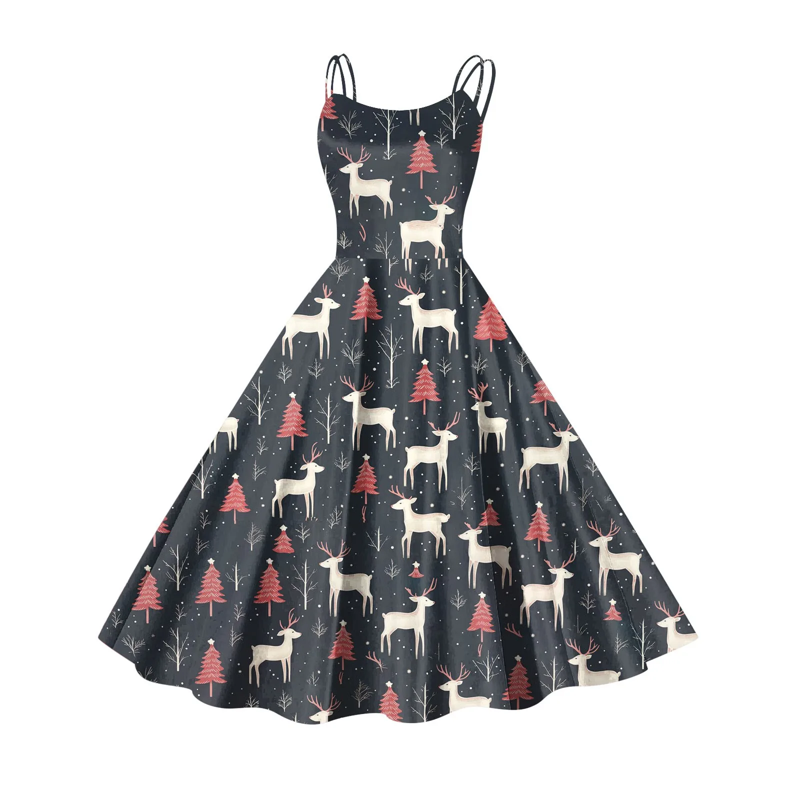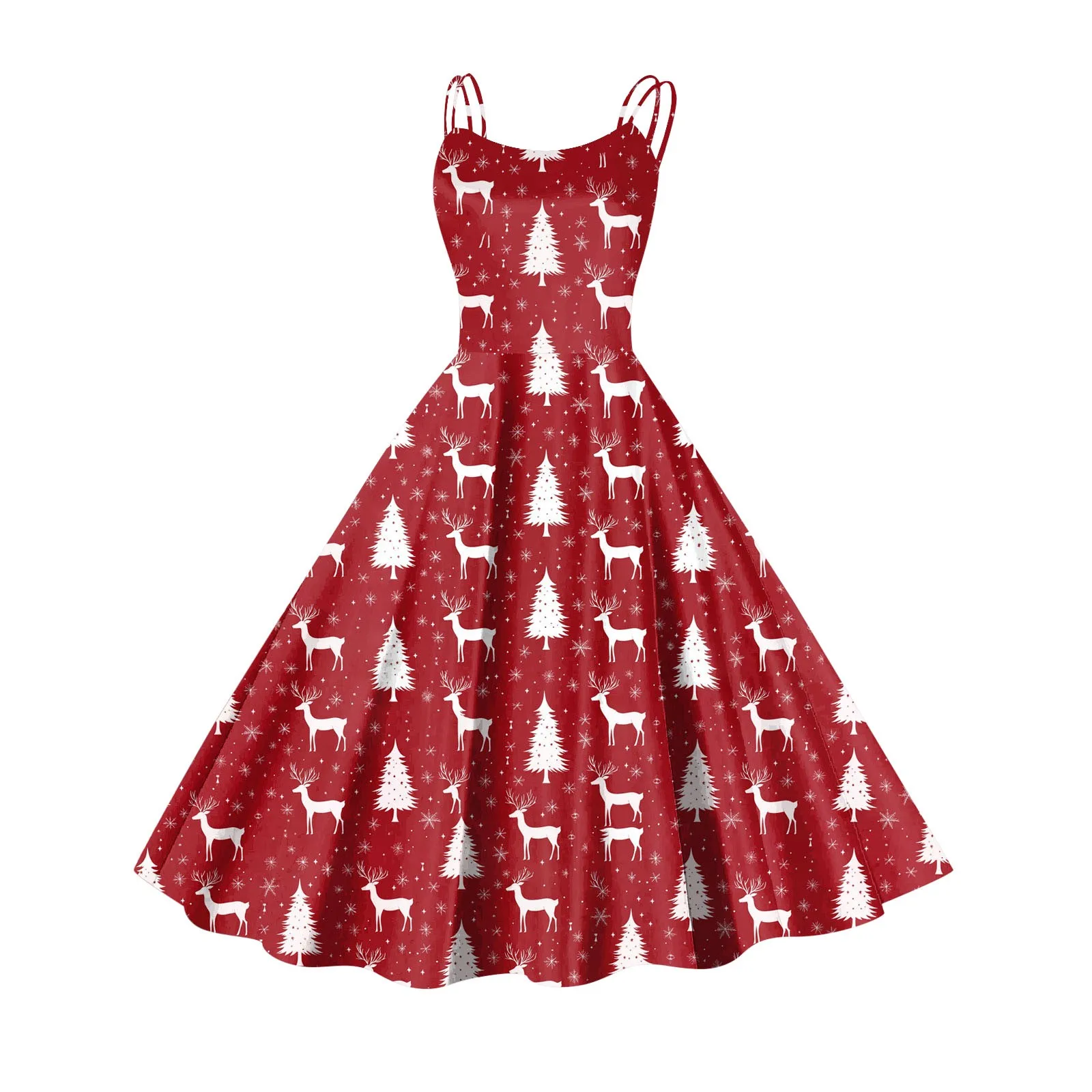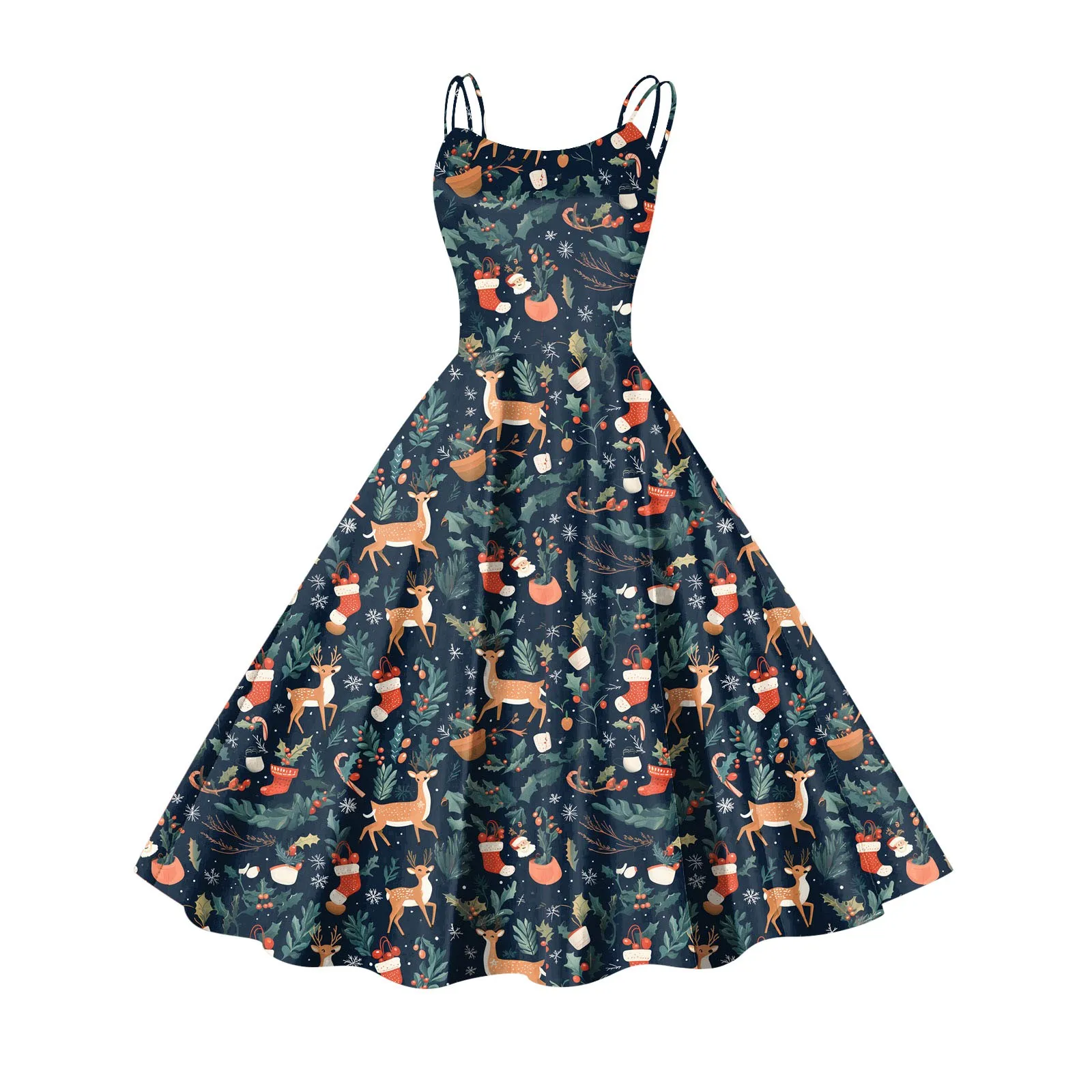Women Christmas Printed Casual Suspender Vintage Sleeveless Dress Christmas Formal Dress