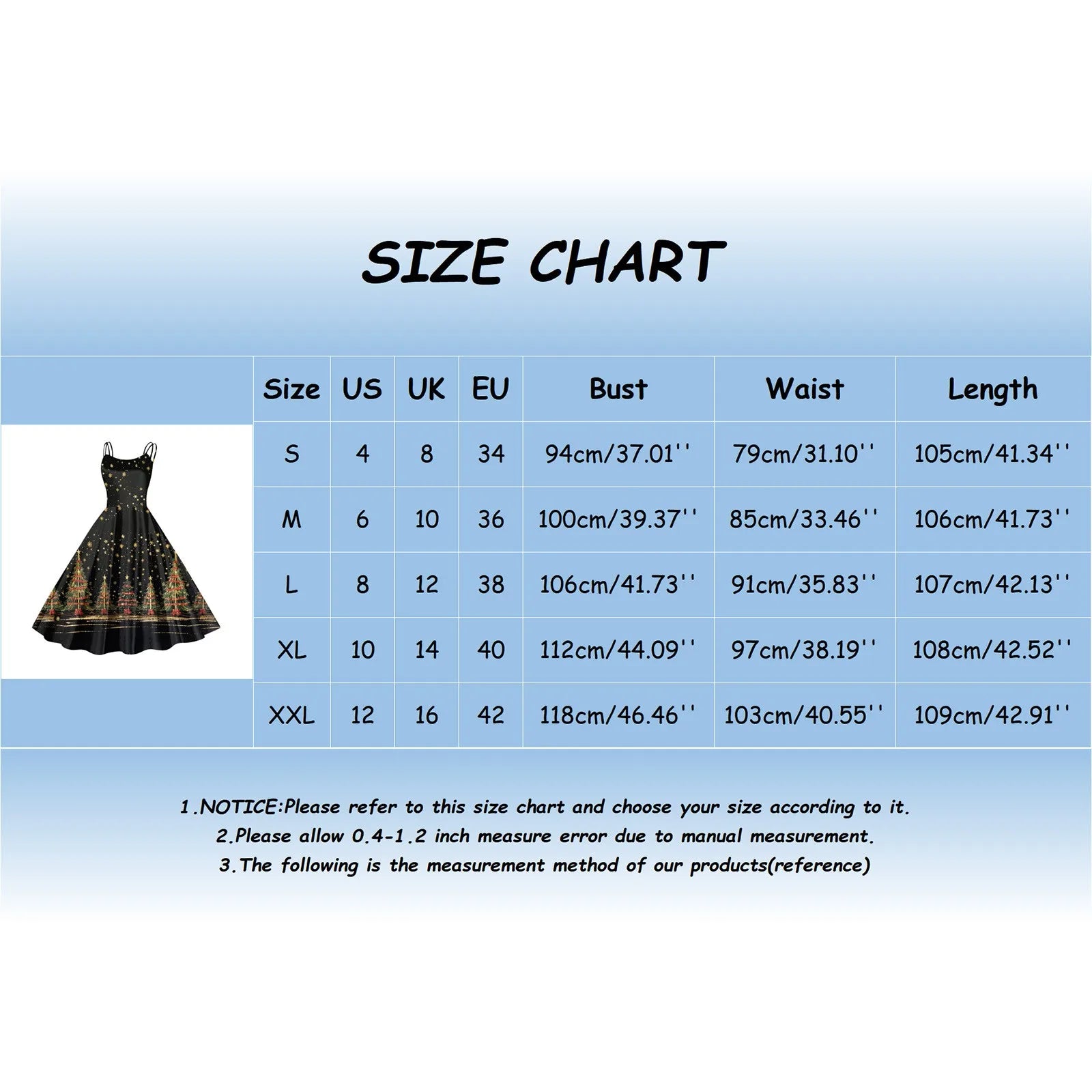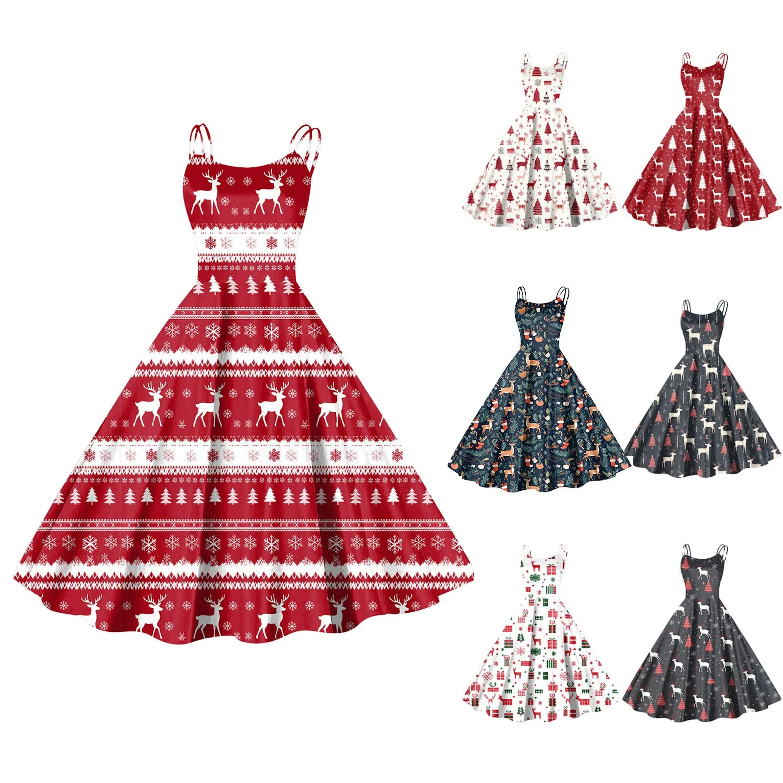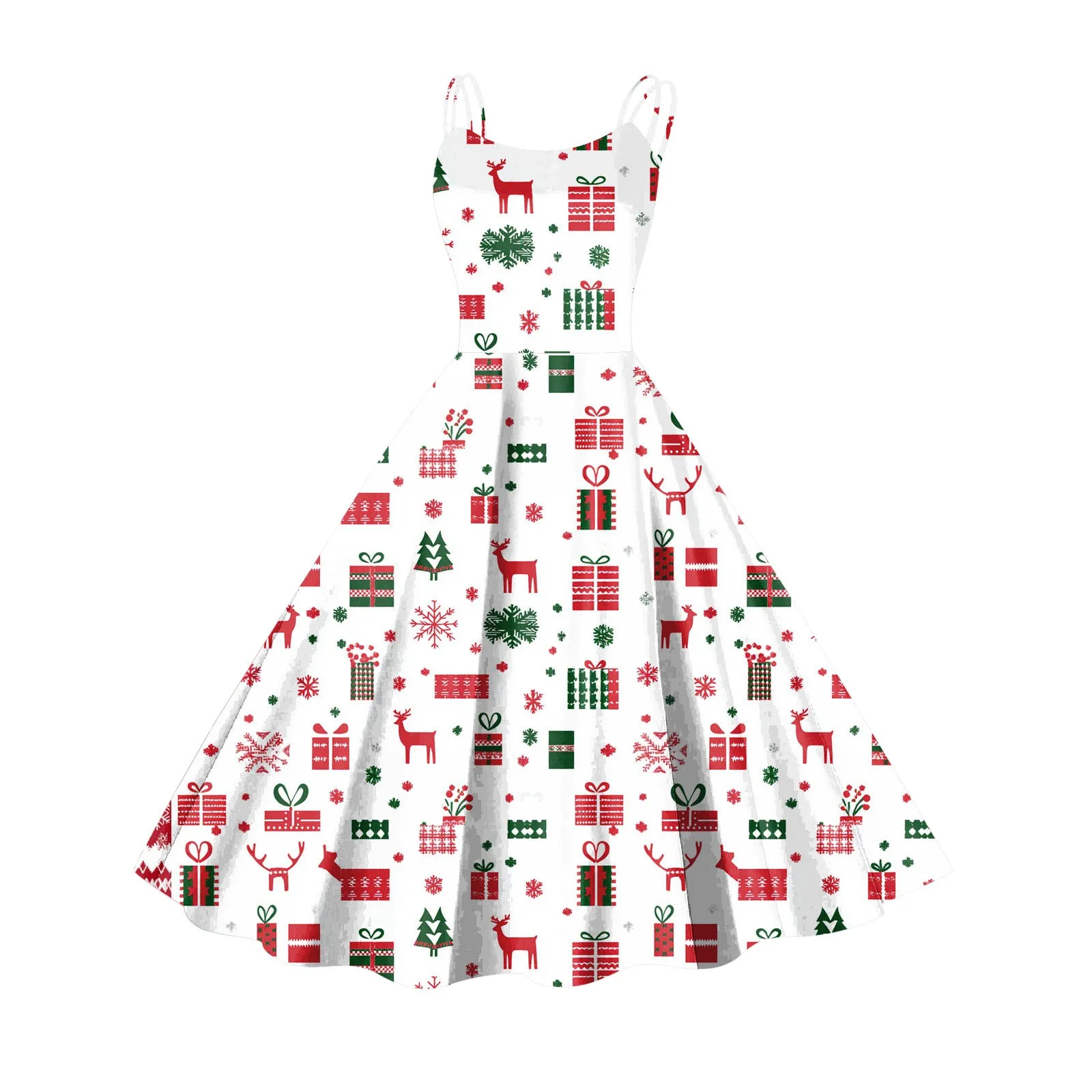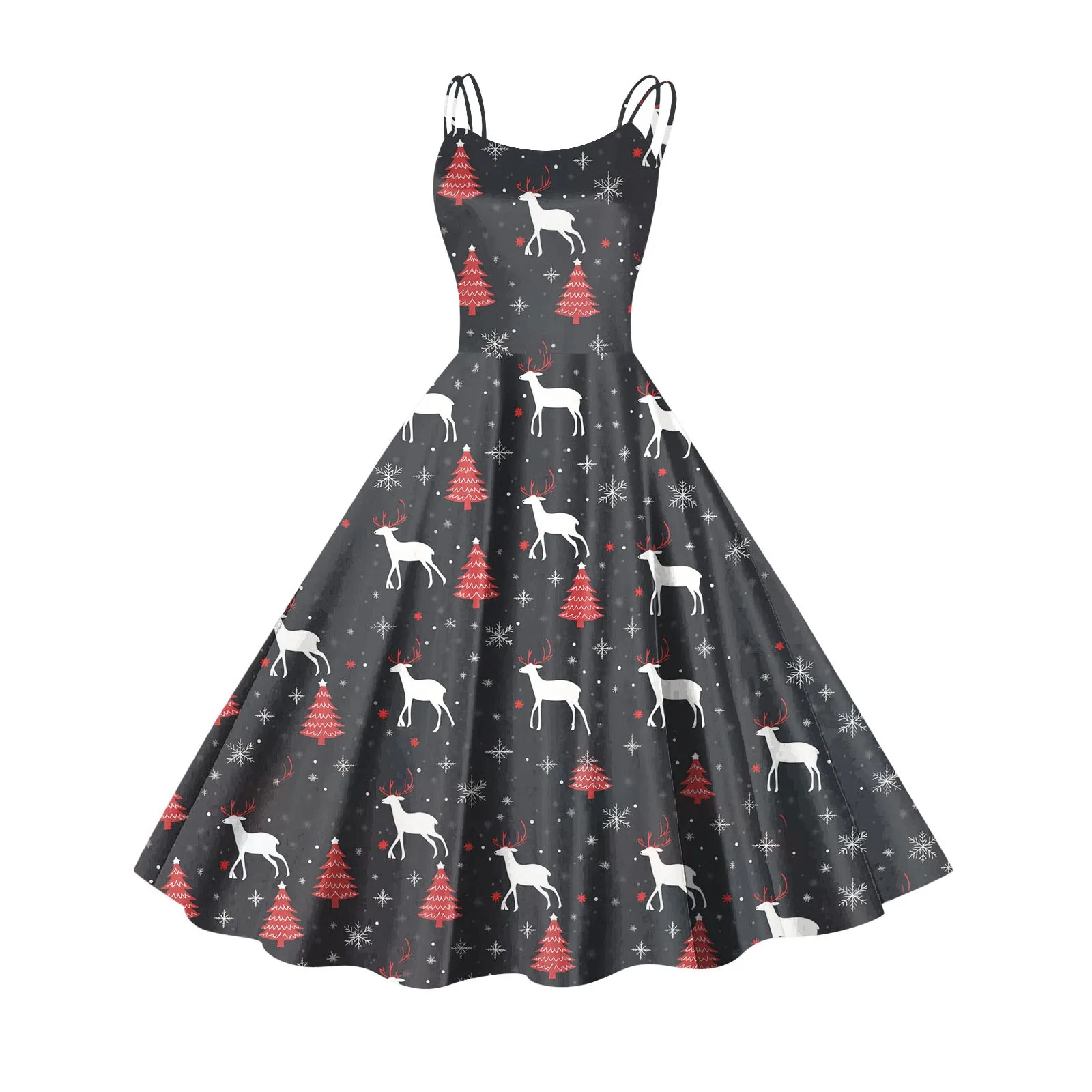 Women Christmas Printed Casual Suspender Vintage Sleeveless Dress Christmas Formal Dress